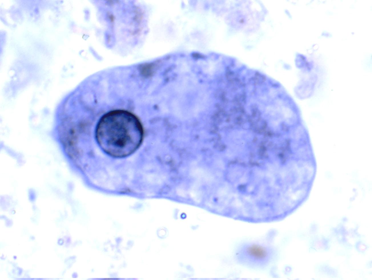 E. histolytica is a non-flagillated only protozoan that infects into the human intestines. It transmits one person to another person by ingesting the feacally contaminated water, food, surface contact. It enters in human body in form of non-infectious cysts. If these cysts survive into acidic stomach they tranform theirselves to trophozoites. Trophozoites are the infectious stage and mainly attacks on human large intestine where it starts distroying tissue and causes internal inflamation and other diseases. Then it encyst and exit from the body with the feces. | |