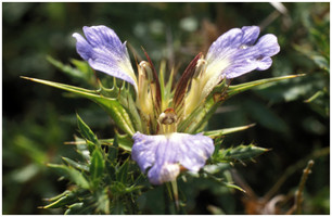 | Description | Blepharis edulis is a small, grey-pubescent or nearly glabrous perennial herb. The stem is rigid and prickley. The plant has numerous serrate leaves, which are armed with prickles. The flowers are yellow. The capsules are 2-seeded, seeds are heart shaped, smooth and shining, flattened of a brownish color.