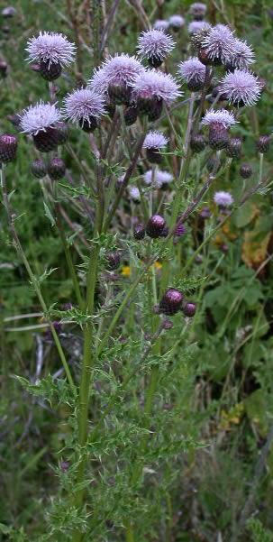 | Description | It is an herbaceous perennial with erect stems 1-4 feet tall, prickly leaves and on extensove creeping rootstocks. Stems are branched, often slightly hairy, and ridged. Leaves are lence-shaped, irregular lobed with spiny, toothed margins and are borne singly and alternativly along the stem. Rose-purple, lavender, or sometimes white flower heads. Fruits: cypsels smooth. Flowers and fruits appears during December-March. |